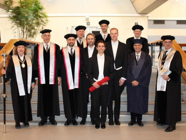 Dr. Gabriele Dell'Orto just following the awarding of the doctorate on Februrary 25, 2025. Left to right: Madam Beadle, Riender Happee, Jason K. Moore, Frans van der Helm, Pier de Jong, Gabriele Dell'Orto, Malte Rothhämel, Teddy Vijfvinkel, Igo Bessilink (top row), Giampiero Mastinu (bottom row), Bart van Arem