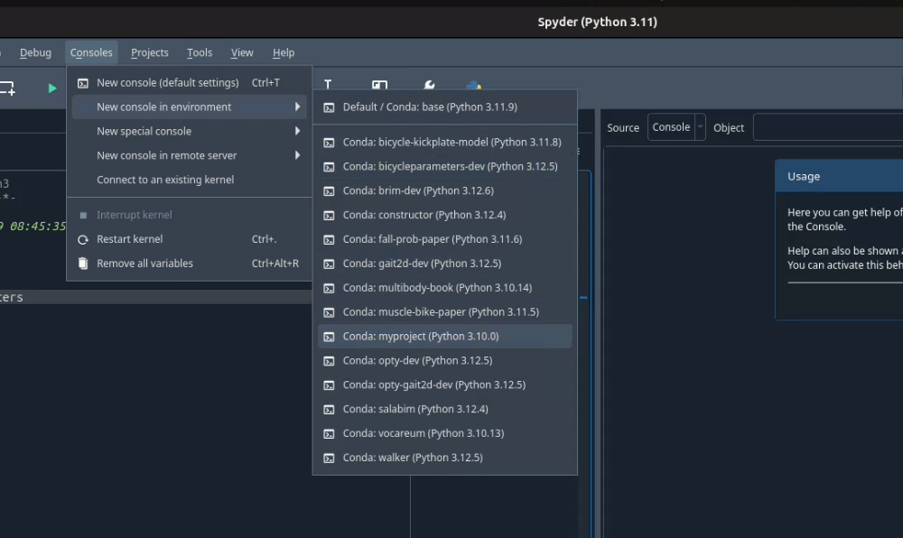 Now, open Spyder and find the preferences that let you set the Python interpreter. You should find this under this menu path: "Tools -> Preferences -> Python interpreter -> Use the following Python interpreter". Paste the path from the prior command line command into this field and apply the preferences. New and restarted Spyder consoles will execute code in your project environment. See this blog post for more information: