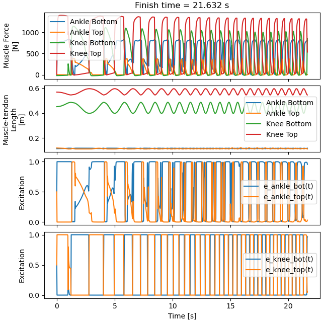 The four muscle forces, muscle lengths, and muscle excitations versus time during the 80 meter time trial with the minimum race time shown at the top.