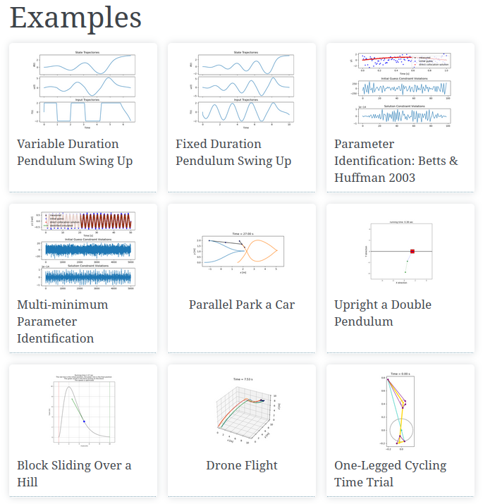 SymPy 1.13 was released on July 8, 2024. This release includes all of the work we did under the CZI Open Source Software for Science Cycle 4 grant. For example, SymPy now includes new features for modeling biomechanical multibody systems. The new features include model construction from joints via a system manager and force actuator classes including a musculo-tendon model. At the close of the grant period, we demonstrated how these features can be used in the solution of biomechanical trajectory optimization and parameter estimation optimal control problems, but only from development branches of the various intertwined software packages. Today, we released Opty 1.3 which can now be used alongside SymPy 1.13 to solve biomechanical optimal control problems. Opty can now handle symbolic equations of motion that have many millions of mathematical operations and tens of thousands of constraints and optimization variables. To help grow adoption, we've built out a new example gallery that demonstrates how Opty can be used to solve a variety of problems: