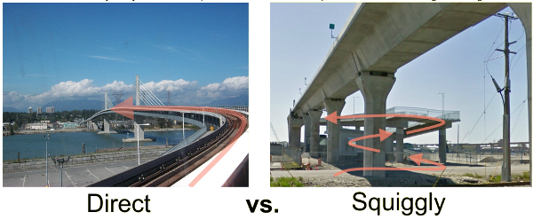 Direct and squiggly routes have time and energy costs for bicyclists.